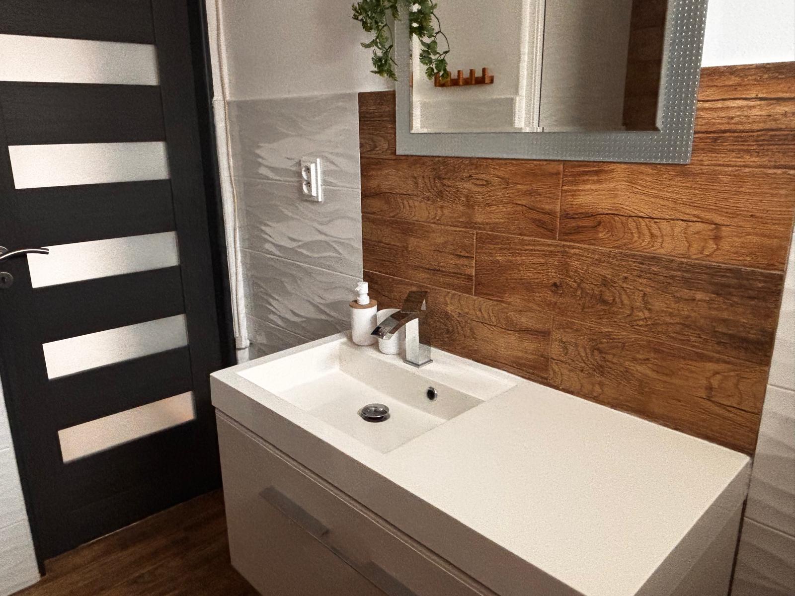 Nově jsme pro vás zrekonstruovali koupelnu se sprchovým koutem, toaletou a umyvadlem. Je zde dostatek odkládací plochy.