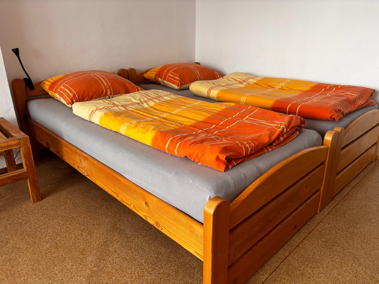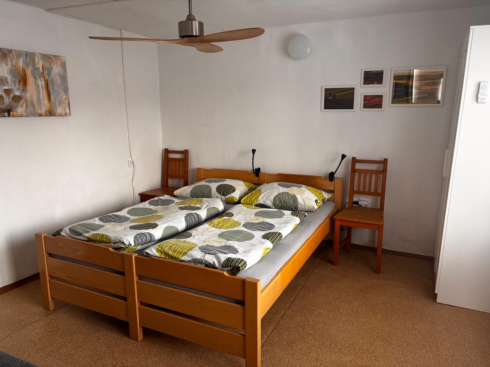 V této ložnici jsou vám k dispozici 3 plnohodnotná lůžka a kvalitní přistýlka. Pokoj je dále vybaven šatní skříní a větrákem pro letní noci.